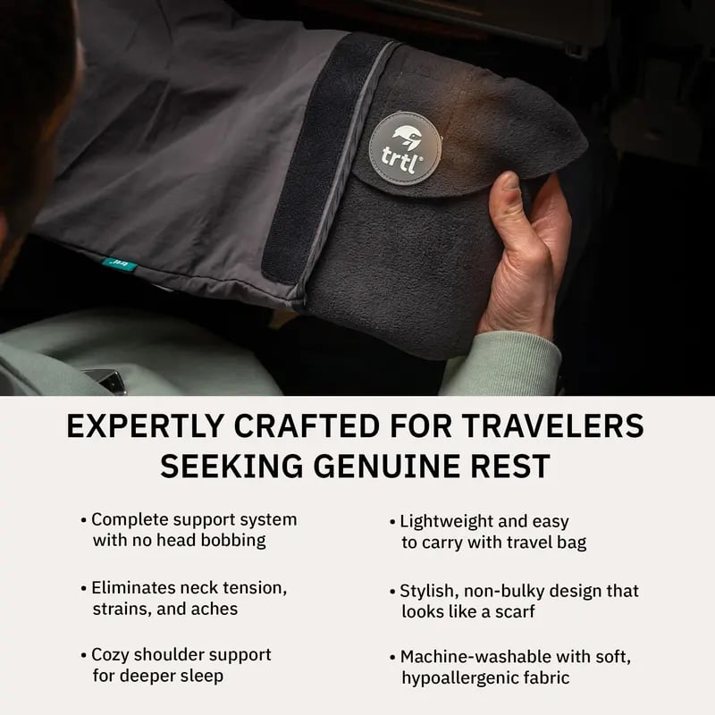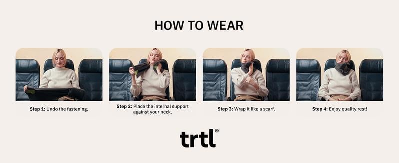 Expertly Crafted for Travelers Seeking Genuine Rest Made from super-soft, skin-friendly fabric, the Trtl Travel Pillow provides cozy shoulder support in a stylish, non-bulky design that looks like a scarf. How to Wear Using the Trtl Pillow is easy—just undo the fastening, place the internal support against your neck, and wrap it like a scarf. Then, sit back and enjoy quality rest!